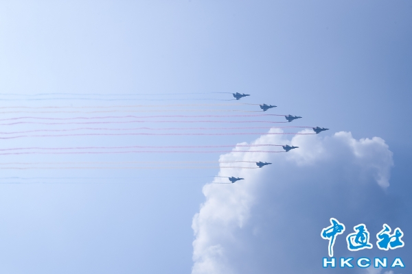 9月3日上午,紀念中國人民抗日戰爭暨世界反法西斯戰爭勝利80周年大會在北京天安門廣場隆重舉行。圖為空中梯隊接受檢閱。(香港中通社記者 謝光磊攝)