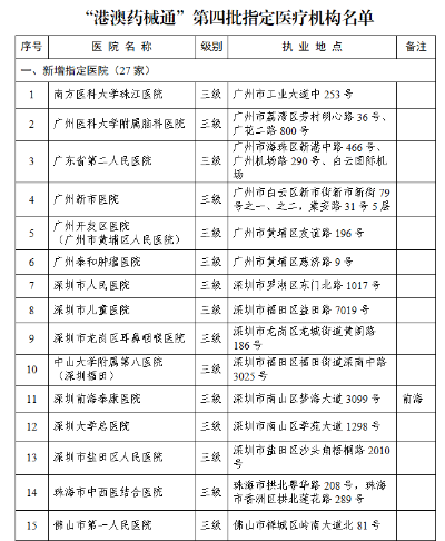 通知稱,根據國家《粵港澳大灣區藥品醫療器械監管創新發展工作方案》(國市監藥〔2020〕159號)和推進“港澳藥械通”實施計劃,依據相關法規規定,通過地市評估上報,經審核確定粵港澳大灣區“港澳藥械通”第四批指定醫療機構名單,包括新增27家、移出1家。