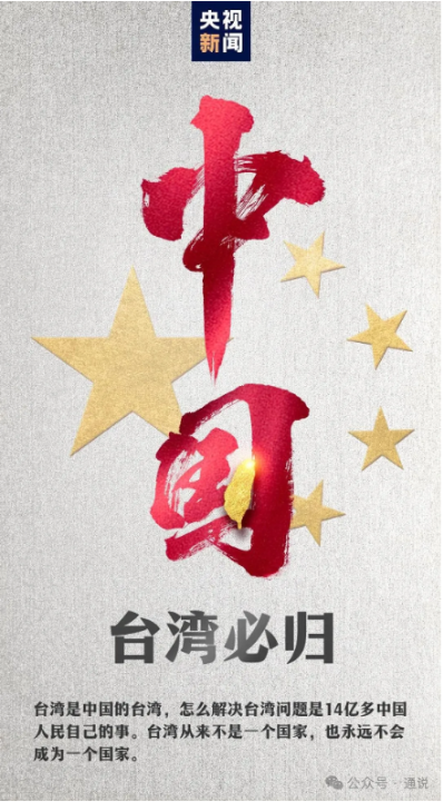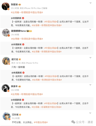 近日,央視新聞官方微博發佈了一條意義非凡的微博:“台灣是中華民族的台灣省,台灣只能是中國的台灣省"。這條微博一出,立刻在網絡上掀起熱議,多位活躍在大陸市場的台灣藝人紛紛轉發,并留言“只有一個中國”。“台灣必歸”等話題也登上大陸社交媒體熱搜。