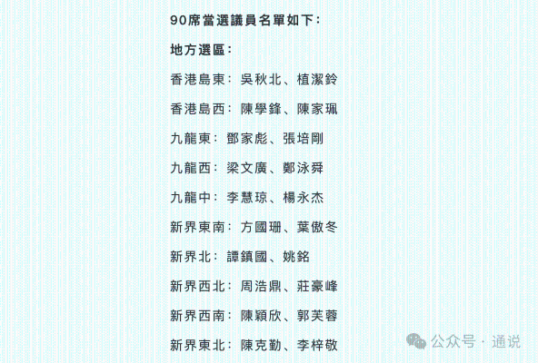 另外,今屆90個議席按法定比例配置,當中超過40%名額由新上任議員擔任。40個選委會議席中,16人是新面孔;30名功能界別議員中,誕生16名新星;地區直選的20個席位中,8人是首次當選。
