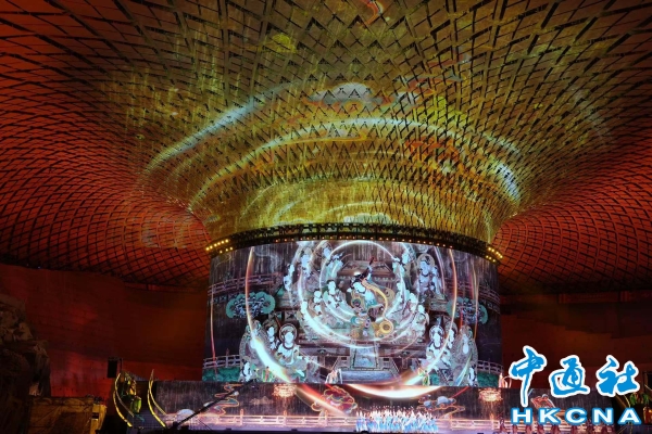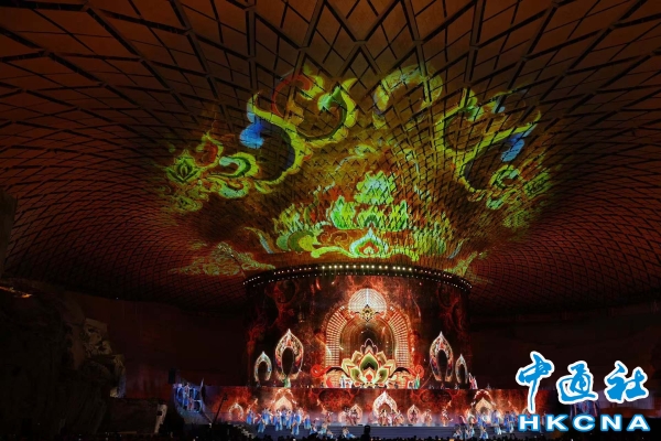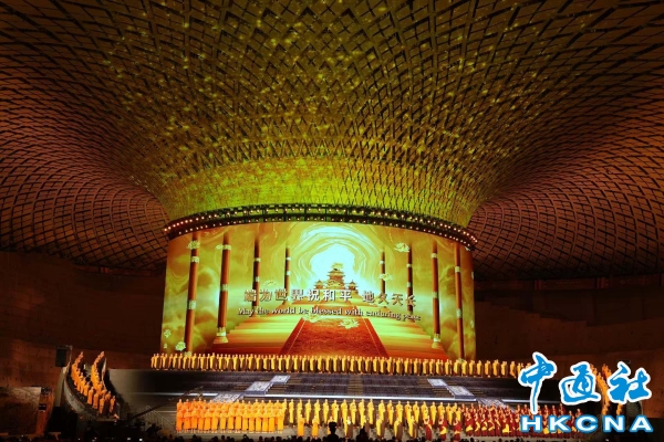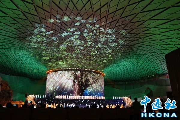 10月15日晚,第六屆世界佛教論壇在浙江寧波彌勒聖壇開幕。隨著演出進行,穹頂呈現出七彩變幻。 佛教音樂響起,大屏幕與穹頂隨之組合形成一課蒼天大樹,華美壯觀。 舞者翩翩起舞,伴隨著音樂,大屏幕與穹頂形成組合變幻,頗為壯觀。 逾百位僧侶們分列在舞台,齊聲誦經,祈願世界和平,場面莊嚴肅穆。 (香港中通社記者 施鑫岳攝)