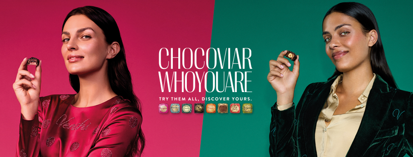 Chocoviar標誌性魚子醬碎粒巧克力,結合柔滑的牛奶或黑巧克力外層,以及不同稠度的夾心內餡,層層交織,入口瞬間體驗三重濃醇享受。經典牛奶脆片巧克力、甜意繚繞的焦糖軟心巧克力、香濃可可奶油巧克力、搭配香脆果仁的開心果巧克力、豐盈渾厚的75%黑巧克力,以及清新柑橘芬芳的橙味巧克力,聯同新登場、香氣馥郁的紅莓與溫潤綿密的榛子蓉口味,共八款獨運匠心的創作滿足多元味蕾期待,令人回味無窮。