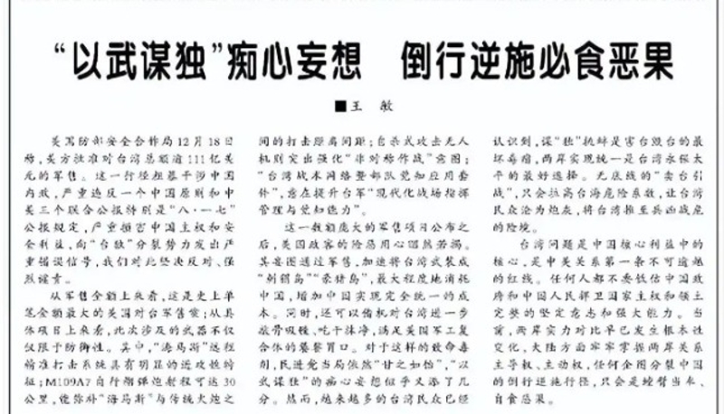 解放軍報詳解美對台111億美元軍售案:具明顯進攻性特徵