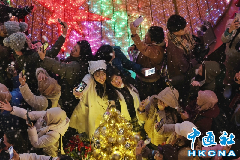 12月26日,聖誕翌日,香港灣仔利東街“Luminous Carnival”璀璨依舊,人工飄雪如期紛飛,吸引大批市民冒寒前來。現場8米高幻彩聖誕樹與空中摩天輪燈飾交相輝映,雖聖誕正日已過,但現場人流不減,不少家庭趁假期尾聲前來體驗“白色浪漫”。圖為遊客紛紛舉起手機記錄飄雪瞬間。(香港中通社記者 鄧梓傑 攝) 香港中通社圖片