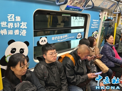 香港市民搭乘大熊貓主題地鐵列車