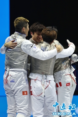 香港男子花劍隊奪冠後激情慶祝