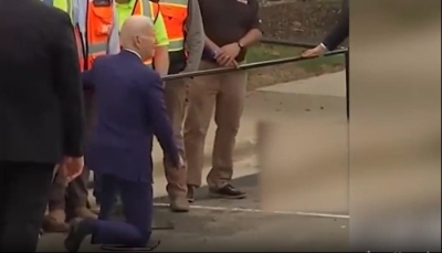 美國總統拜登近日視察北卡羅來納州一家半導體工廠並發表講話。講話結束後,拜登與現場工人互動後,在最後的合影環節,拜登突然單膝跪地。