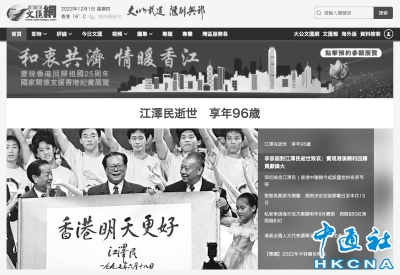 香港中通社12月1日電 (記者 張明臻)中國前最高領導人江澤民2022年11月30日在上海逝世,享年96歲。消息公佈後,香港各大媒體第一時間轉發權威消息,并以文章、圖片、視頻、網頁等形式在頭版首頁等顯著位置,持續發出大量報道。 多家報紙報頭頭版、新聞網站首頁、電視台台標等皆轉為黑白,以示悼念。《大公報》《文匯報》《星島日報》《明報》等幾乎全部報紙頭版全版都報道江澤民逝世的消息;有些報紙用四、五個要聞版面都登載江...