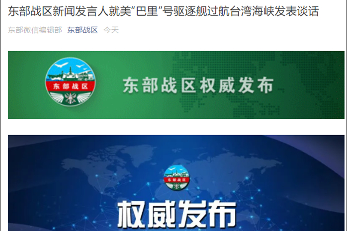 香港新聞網9月18日電 微信公眾號“東部戰區”18日消息,東部戰區新聞發言人就美“巴里”號驅逐艦過航台灣海峽發表談話。 東部戰區新聞發言人施毅陸軍大校表示,9月17日,美“巴里”號導彈驅逐艦過航台灣海峽並公開炒作。中國人民解放軍東部戰區組織兵力對美艦過航行動全程跟監警戒。美方頻頻實施類似挑釁行徑,充分說明美是台海和平穩定破壞者、台海安全風險制造者。戰區部隊隨時保持高度戒備,堅決捍衛國家主權安全和地區和平穩定。
