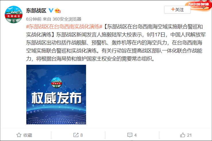 香港新聞網9月18日電 @東部戰區 9月18日消息,東部戰區新聞發言人施毅陸軍大校表示,9月17日,中國人民解放軍東部戰區出動包括作戰艦艇、預警機、轟炸機等在內的海空兵力,在台島西南海空域實施聯合警巡和實戰化演練。有關行動旨在提高戰區部隊一體化聯合作戰能力,將根據台海局勢和維護國家主權安全的需要常態組織。