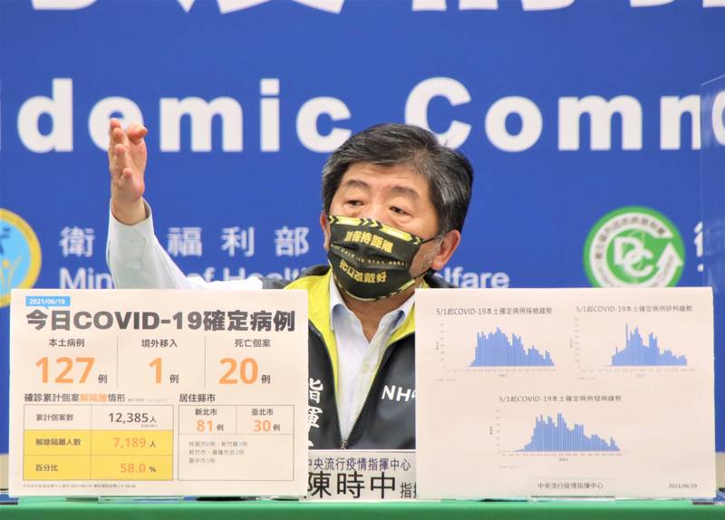 香港新聞網6月19日電 台灣地區流行疫情指揮中心今日(19日)公布,台灣新增128例新冠肺炎確診病例,分別為127例本土病例及1例境外輸入。確診病例中新增20例死亡病例。 指揮中心稱,今日新增的127例本土病例,為60例男性、67例女性,年齡介於未滿5歲至90多歲,發病日介於今(2021)年6月3日至6月18日。 個案分布以新北市81例最多,其次為台北市30例,桃園市8例,新竹縣3例,新竹市、基隆市各2例,台...