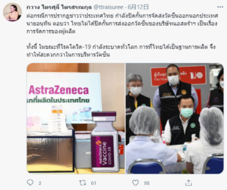 香港中通社6月13日電 台灣當局領導人蔡英文11日表示,供應台灣的阿斯利康疫苗藥廠,主要在泰國生產,但是泰國疫情嚴重,優先把疫苗留在國內。路透社報道,泰國總理府副發言人黛素麗在推特否認這項說法。 黛素麗指,泰國沒有阻擋阿斯利康疫苗出口,這和廠商管理有關。 不過,黛素麗沒有指明,她所說的疫苗廠商是阿斯利康,還是暹羅生物科學集團。 阿斯利康疫苗在東南亞配送計劃,仰賴泰國的暹羅生物科學集團生產2億劑。這家公司由泰...