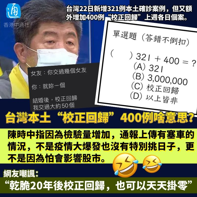 台灣今(22)日新增321例本土確診案例,但又額外增加400例“校正回歸”上週各日個案,讓不少人都擔心是否有“蓋牌之嫌”,引起網友熱議,PTT八卦版更被瘋狂洗板,出現“黃爆”現象(指同時在線人數超過6萬人)。 有網友在PTT中PO文表示,陳時中在記者會上說,今天新增本土321例但400例校正回歸,並問道“什麼叫做400例校正回歸?是我國文太差嗎?”他表示,懷疑因為案例太多,所以拉400例出來另立名目,於是他就懷...