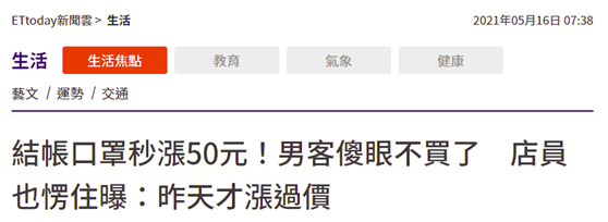 台灣疫情暴發引發搶購,口罩秒漲50新台幣,顧客傻眼