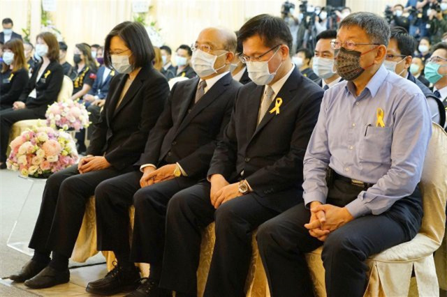 台鐵太魯閣號408次列車2日發生嚴重出軌意外,釀成49死、200多人輕重傷慘劇。“交通部”今天下午在台北市立第一殯儀館景行廳舉行台鐵太魯閣號408次列車事故聯合追思公祭。蔡英文主祭後,在“行政院長”蘇貞昌、“交通部長”林佳龍的陪同下,向罹難者家屬致哀,蘇貞昌則在送蔡英文離去後,在代表“行政院”拈香致意。台北市長柯文哲和副市長黃珊珊、新北市長侯友宜等市府團隊也分別拈香致意。蔡英文等一行人離開時皆未受訪。 台鐵太魯...