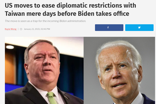 香港新聞網1月12日電 當地時間1月10日,美國國務卿蓬佩奧宣布“解除‘美台關系’中的自我限制”。這件在外媒看來明顯是一出小把戲的事,到了台當局這裏卻成了“美台”關系中的“大事”。 華盛頓智庫高級顧問:為什麽4年前不這麽做? 11日,美國網站Mothership援引華盛頓智庫“戰略與國際研究中心”高級顧問葛來儀的話稱,對於特朗普政府在卸任前最後幾天做出的決定,拜登政府很可能不會贊成。 葛來儀本人還發推表示,...