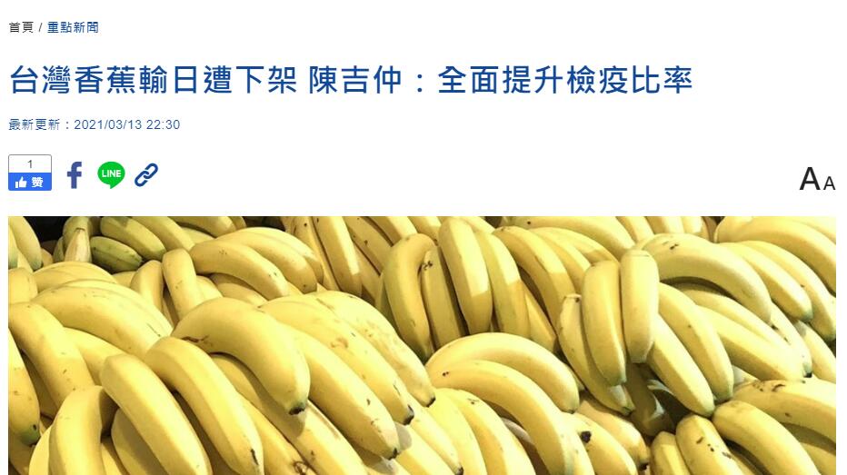 台“行政院長”蘇貞昌和“農委會”主委陳吉仲近日都在臉書宣稱,台灣向日本提送“鳳梨、芒果、火龍果”的“良好農業規範(TGAP)2020 PLUS”獲得日方認可,是繼去年香蕉通過東奧組委會認可後再次成功進軍東奧的水果。台媒報道稱,沒想到最新消息傳出,台灣出口日本的香蕉因農藥超標問題,被下架回收。 台媒報道截圖 據台灣“中央社”“中時新聞網”等媒體3月13日報道,日本食品公司Wismettac(日...