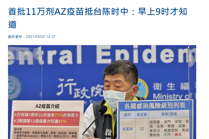 據台媒3日報道,首批新冠疫苗已於當天早上運抵台灣。不過,在多家有關該消息的報道里,有關疫苗的來源和劑量總數卻出現了不同的說法。 據台灣“中央社”今天下午2點的報道,首批運抵台灣的是由牛津大學聯合阿斯利康開發的這款疫苗,劑量總計11.7萬。台灣防疫部門負責人陳時中在今天記者會中表示,這批疫苗是台灣當局向阿斯利康直接采購的1000萬劑中的一部分。 陳時中還補充了一個細節,他對記者稱自己也是在3日上午9點左右才知道...