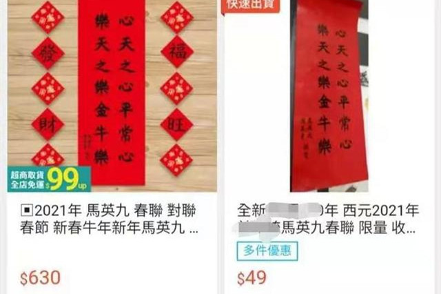 春節將屆,島內政治人物印制春聯供民眾索取、拜年搏感情。但因人氣不同,各自春聯在網拍市場行情落差不小。截至目前,台灣地區前領導人馬英九牛年春聯仍最搶手,每幅最高叫價731元(新台幣,下同),更是淘寶網上唯一拍賣的台灣政治人物春聯。 只不過與2019年相較,當時馬英九春聯在島內每幅曾叫價888元新台幣,大陸淘寶網一幅賣更是賣到12299元人民幣,今年政治人物春聯“拍賣市況”還是低迷不少,多少反映當前景氣狀況。 ...