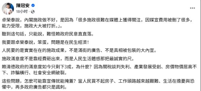 台“大罷免”失敗後,“內閣”進行檢討,台“行政院長”卓榮泰昨日(3日)抱怨,因媒宣費用被刪了很多,很多施政很難在媒體上獲得關注,施政被打折。對此,中國國民黨青年部前主任陳冠安批評,卓榮泰不要再把責任推給在野黨的監督或是宣傳經費不足,“人民要的是實實在在的施政成果,不是滿街的廣告、真相被包裝的大內宣。”