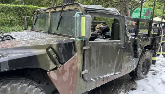 台北消息:台陸軍金門防衛指揮部未爆彈處理小組26日處理銷毀任務,一輛軍用悍馬車在返回部隊途中發生自燃。