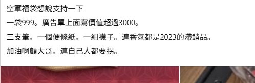 過年期間不少人喜歡買福袋試試手氣,有台軍官兵近日購買島內空軍服裝供售站售價999元的福袋,聲稱價值超過3000元,結果福袋內卻是筆、便利貼、襪子,以及滯銷香氛等物品。