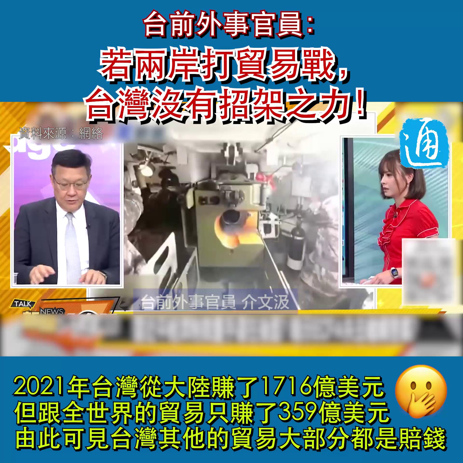 早前大陸宣布暫停進口台灣地區部分水果及農漁產品,近日亦有台商稱出口大陸貨物要求標明“中國台灣”,就兩岸經貿,台前外事官員介文汲在島內節目上直言,若兩岸打貿易戰,台灣沒有招架之力。