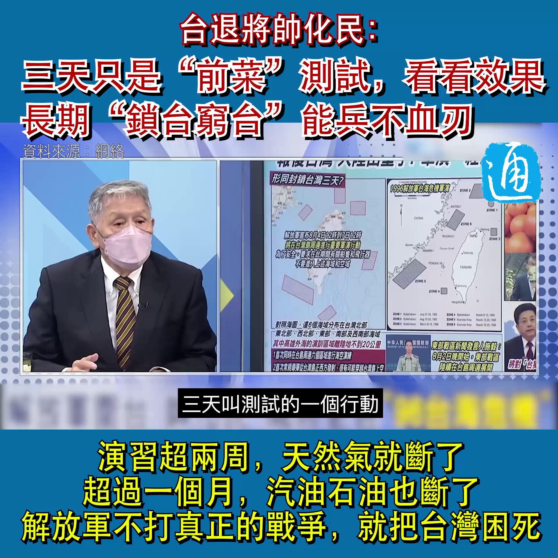 解放軍今日(4日)起在台島周邊開展為期三天的軍事演訓行動,台軍退役中將帥化民在政論節目上指出,三天只是“前菜”測試看看效果,解放軍若長期“鎖台窮台”能“兵不血刃”,不需要打真正的戰爭就把台灣困死。