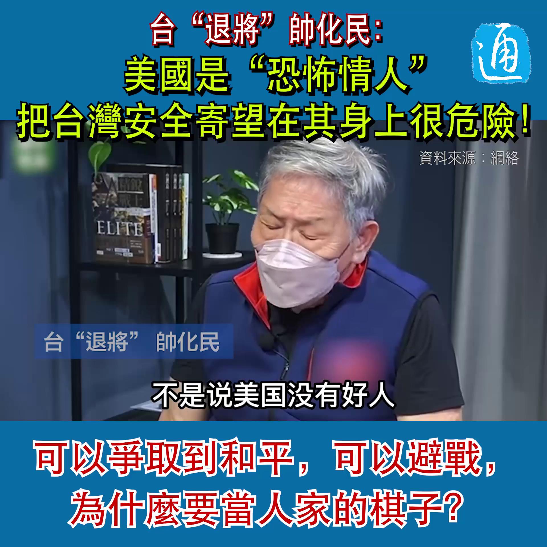 “把今天台灣的安全完全寄望在美國這個’恐怖情人’身上,是很危險的。”台灣“退將”帥化民在節目上呼籲台灣民眾不要被拱火。