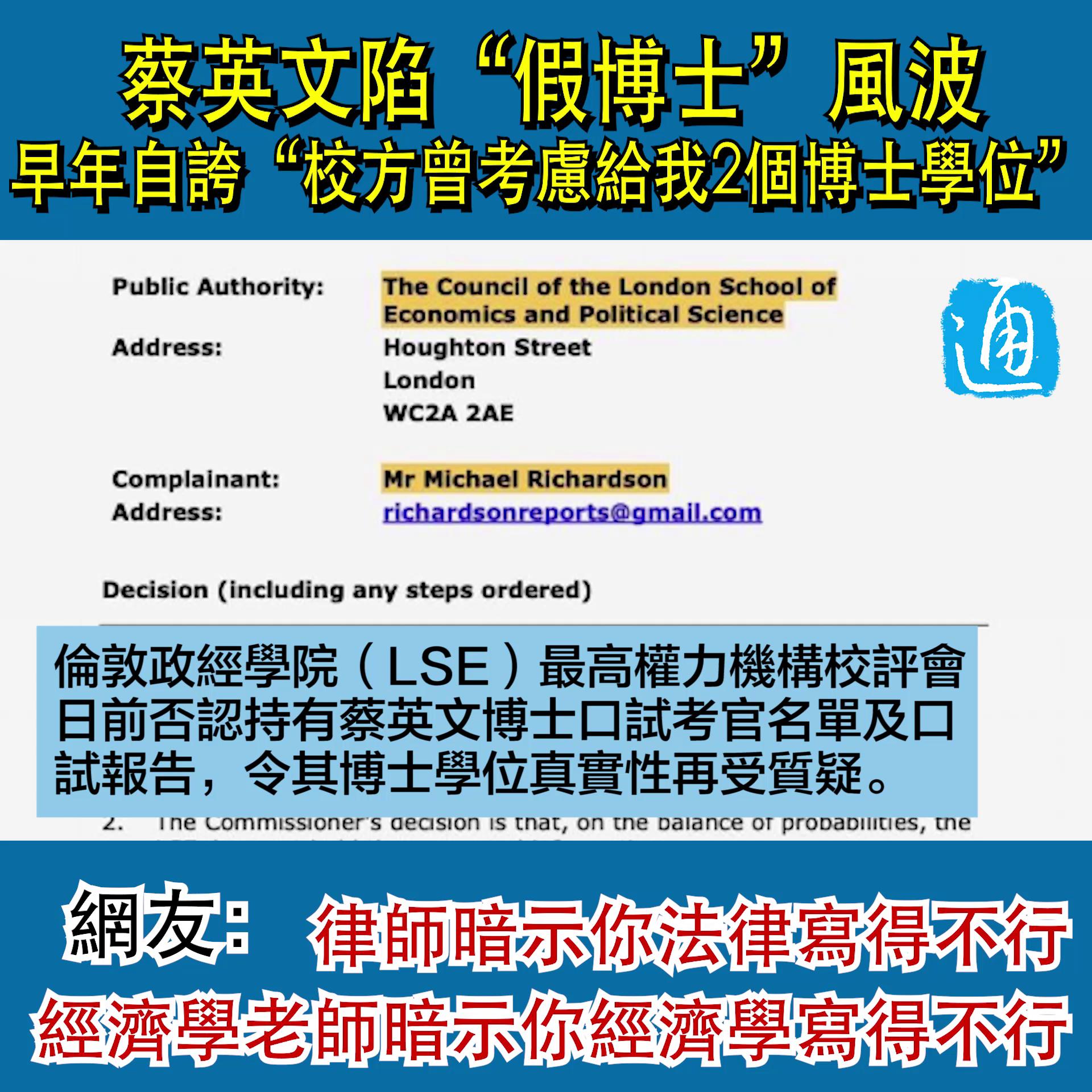 台灣地區領導人蔡英文疑似博士學位造假事件又有新進展。美國北卡大學經濟學系副教授林環牆日前披露,負責調查蔡英文論文事件的英國“信息特任官辦公室”(ICO)簽署的判決文提到,“倫敦政經學院(LSE)最高權力機構校評會,否認持有蔡英文博士口試考官名單及口試報告”。 該判決文內容與此前LSE內部法律團隊代表人海恩(Kevin J. Haynes)去年12月18日向民進黨當局提供蔡英文的2名口試考官消息的情況相矛盾。