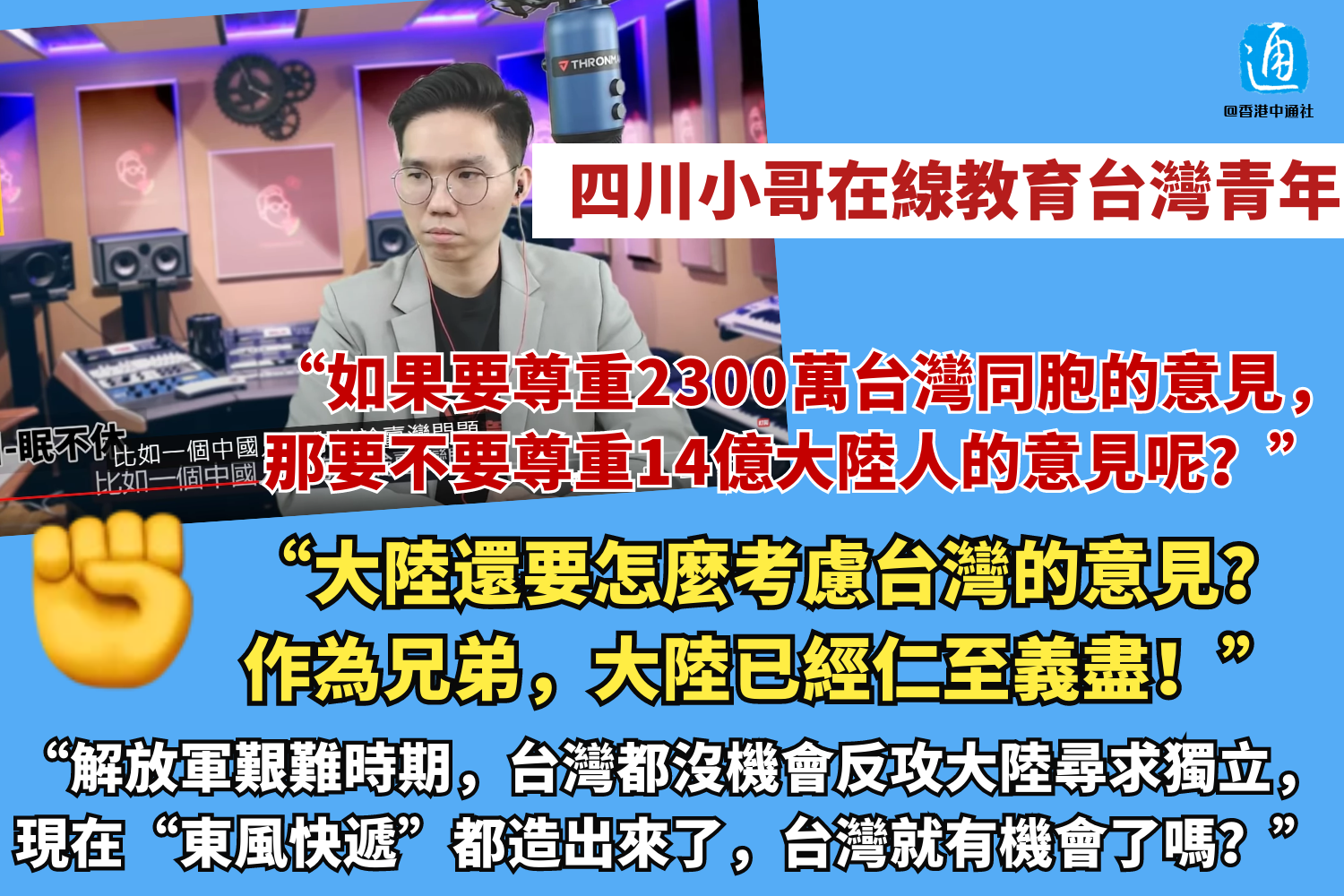 香港新聞網11月2日電 近日,一位四川小哥在台灣網紅“高雄歷史哥”主持的連線對話節目中,有理有據地批評了一些所謂 “自由派”人士宣揚的“為什麼一定要統一台灣”的言論。他幾乎一氣呵成的發言,讓不少網友聽後直呼:一針見血、字字珠璣! 在節目中,這位四川小哥首先闡述了自己對“民主自由”的看法,在討論台灣問題時,重點批駁了某些“自由派”人士提出的看似客觀的言論,如 “為什麼不考慮台灣人的意願”“為什麼一定要統一”“強扭...