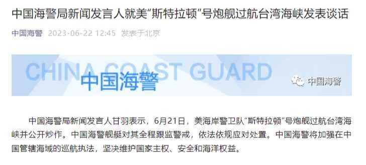 據中國海警局微信公眾號22日消息,中國海警局新聞發言人甘羽表示,6月21日,美海岸警衛隊“斯特拉頓”號炮艦過航台灣海峽並公開炒作。中國海警艦艇對其全程跟監警戒,依法依規應對處置。中國海警將加強在中國管轄海域的巡航執法,堅決維護國家主權、安全和海洋權益。