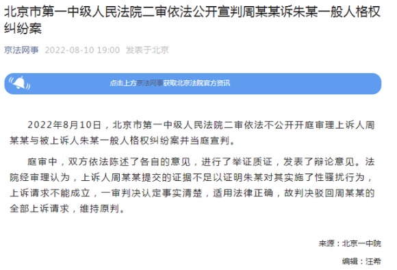 北京一中院:朱某對周某某性騷擾行為證據不足,維持原判