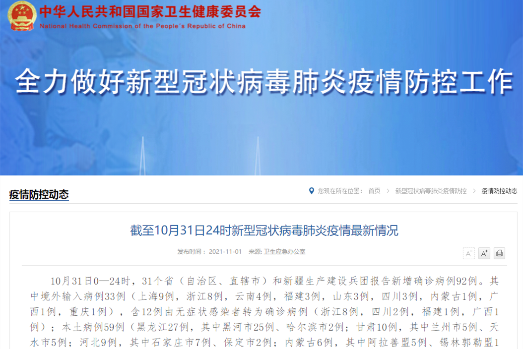 香港新聞網11月1日電 10月31日0—24時,31個省(自治區、直轄市)和新疆生產建設兵團報告新增確診病例92例,其中本土病例59例。 境外輸入病例33例(上海9例,浙江8例,雲南4例,福建3例,山東3例,四川3例,內蒙古1例,廣西1例,重慶1例),含12例由無症狀感染者轉為確診病例(浙江8例,四川2例,福建1例,廣西1例);本土病例59例(黑龍江27例,其中黑河市25例、哈爾濱市2例;甘肅10例,其中蘭州市...