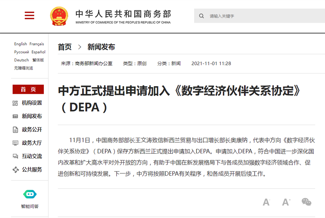 商務部部長王文濤1日致信新西蘭貿易與出口增長部長奧康納,代表中方向《數字經濟夥伴關係協定》(DEPA)保存方新西蘭正式提出申請加入DEPA。商務部表示,申請加入DEPA,符合中國進一步深化國內改革和擴大高水平對外開放的方向,有助於中國在新發展格局下與各成員加強數字經濟領域合作、促進創新和可持續發展。下一步,中方將按照DEPA有關程序,和各成員開展後續工作。