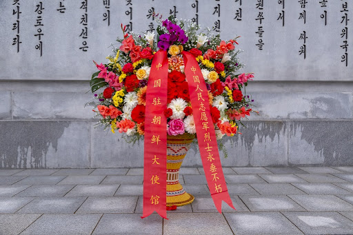 中使館向中朝友誼塔敬獻花籃 緬懷志願軍烈士