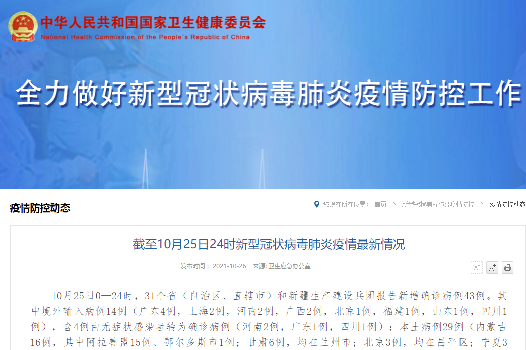 香港新聞網10月26日電 據國家衛健委網站消息,10月25日0—24時,31個省(自治區、直轄市)和新疆生產建設兵團報告新增確診病例43例,其中本土病例29例。 境外輸入病例14例(廣東4例,上海2例,河南2例,廣西2例,北京1例,福建1例,山東1例,四川1例),含4例由無症狀感染者轉為確診病例(河南2例,廣東1例,四川1例);本土病例29例(內蒙古16例,其中阿拉善盟15例、鄂爾多斯市1例;甘肅6例,均在蘭州...