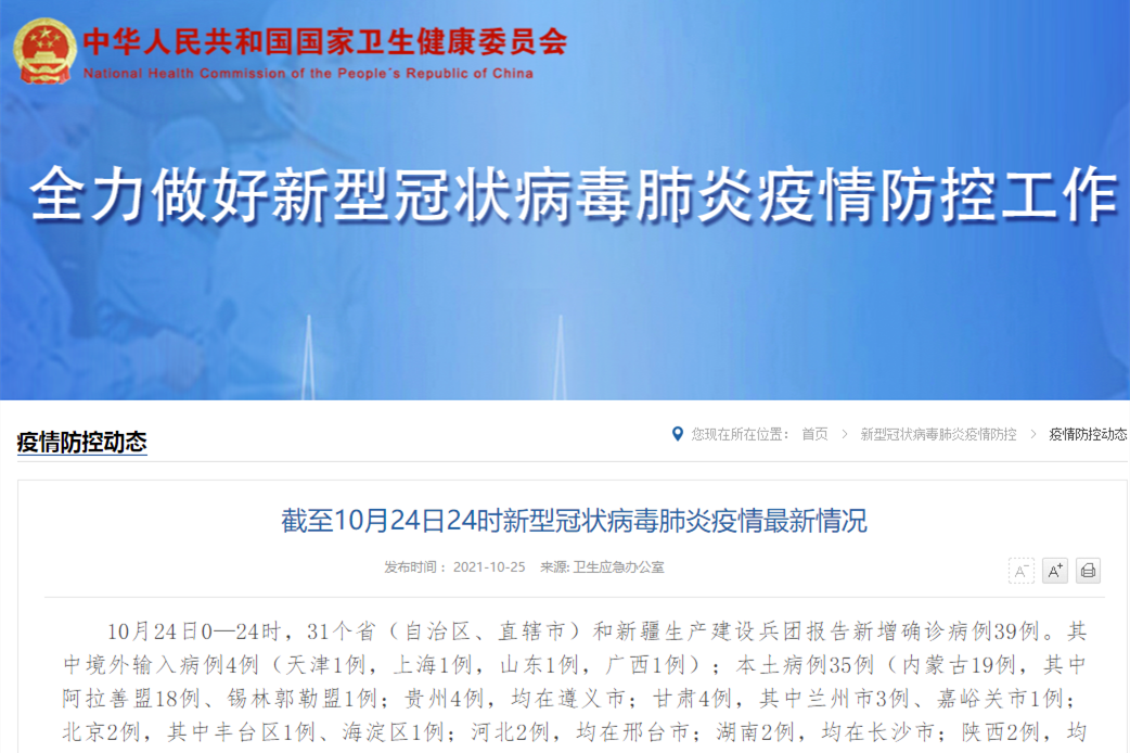 香港新聞網10月25日電 據國家衛健委25日消息,10月24日0—24時,31個省(自治區、直轄市)和新疆生產建設兵團報告新增確診病例39例,其中本土病例35例。 境外輸入病例4例(天津1例,上海1例,山東1例,廣西1例);本土病例35例(內蒙古19例,其中阿拉善盟18例、錫林郭勒盟1例;貴州4例,均在遵義市;甘肅4例,其中蘭州市3例、嘉峪關市1例;北京2例,其中豐台區1例、海澱區1例;河北2例,均在邢台市;湖...