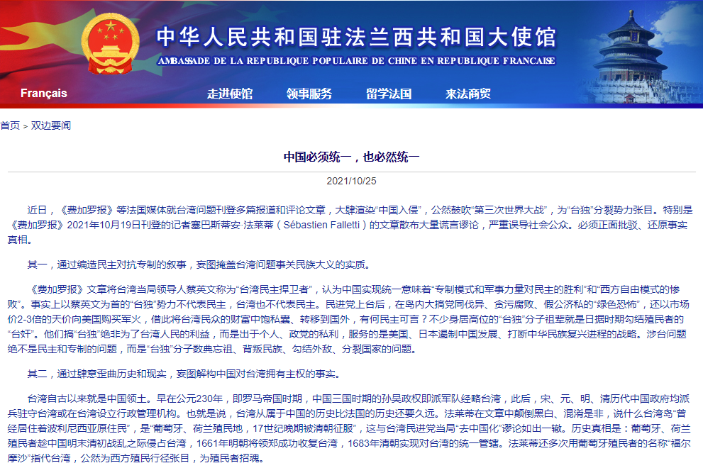 香港新聞網10月25日電 25日,中國駐法國大使館發文《中國必須統一,也必然統一》: 近日,《費加羅報》等法國媒體就台灣問題刊登多篇報道和評論文章,大肆渲染“中國入侵”,公然鼓吹“第三次世界大戰”,為“台獨”分裂勢力張目。特別是《費加羅報》2021年10月19日刊登的記者塞巴斯蒂安·法萊蒂(Sébastien Falletti)的文章散布大量謊言謬論,嚴重誤導社會公眾。必須正面批駁、還原事實真相。 其一,通過...