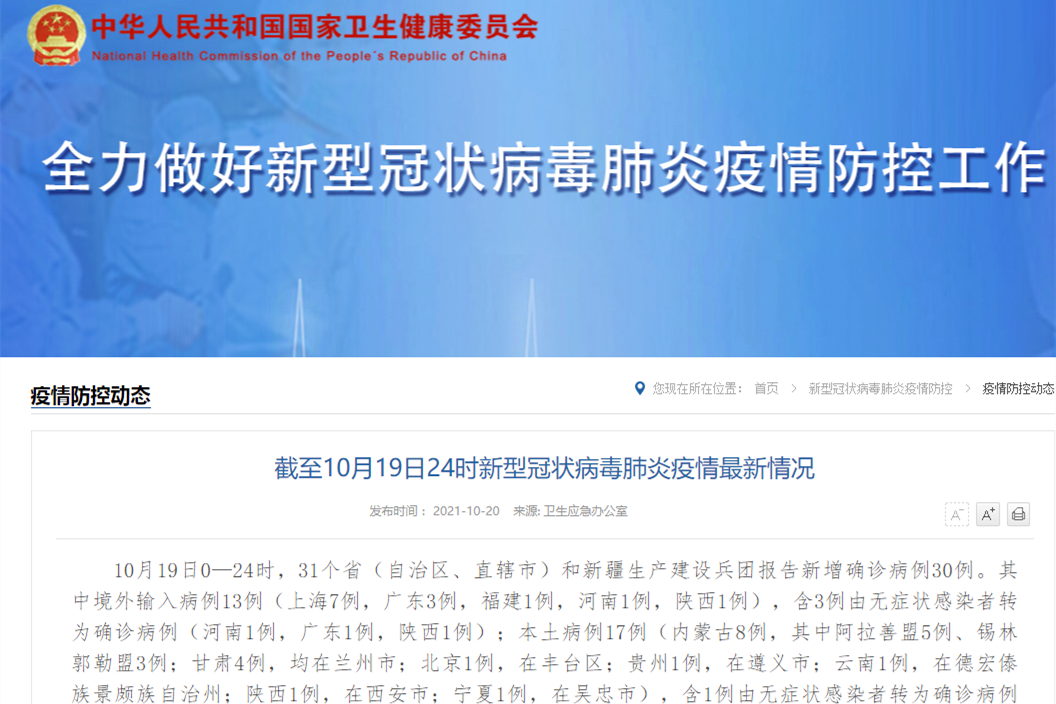 香港新聞網10月20日電 據國家衛健委官網10月20日消息,10月19日0—24時,31個省(自治區、直轄市)和新疆生產建設兵團報告新增確診病例30例,其中本土病例17例。 境外輸入病例13例(上海7例,廣東3例,福建1例,河南1例,陜西1例),含3例由無症狀感染者轉為確診病例(河南1例,廣東1例,陜西1例);本土病例17例(內蒙古8例,其中阿拉善盟5例、錫林郭勒盟3例;甘肅4例,均在蘭州市;北京1例,在豐台區...