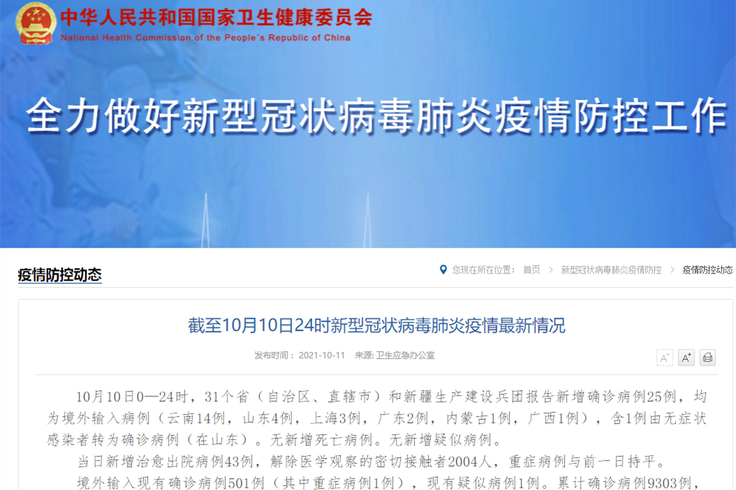 香港新聞網10月11日電 據國家衛健委網站消息,10月10日0—24時,31個省(自治區、直轄市)和新疆生產建設兵團報告新增確診病例25例,均為境外輸入病例(雲南14例,山東4例,上海3例,廣東2例,內蒙古1例,廣西1例),含1例由無症狀感染者轉為確診病例(在山東)。無新增死亡病例。無新增疑似病例。 當日新增治愈出院病例43例,解除醫學觀察的密切接觸者2004人,重症病例與前一日持平。 境外輸入現有確診病例5...