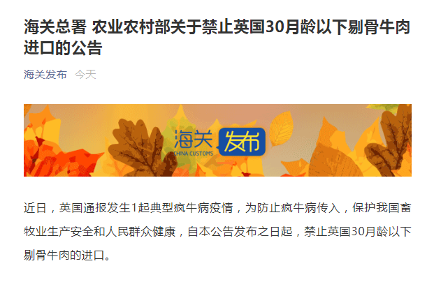 香港中通社10月11日電 針對英國通報發生瘋牛病,中國海關總署微信公眾號11日消息,海關總署、農業農村部發布關於禁止英國30月齡以下剔骨牛肉進口的公告。 公告表示,近日,英國通報發生1起典型瘋牛病疫情,為防止瘋牛病傳入,保護中國畜牧業生產安全和人民群眾健康,自本公告發布之日起,禁止英國30月齡以下剔骨牛肉的進口。