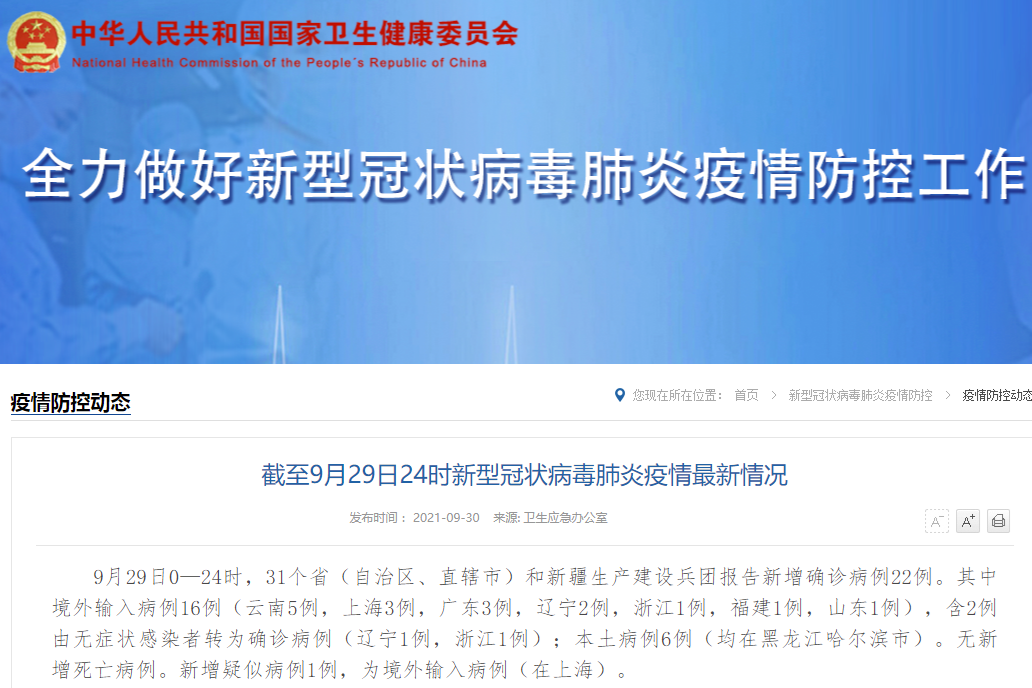 香港新聞網9月30日電 據國家衛健委網站消息,9月29日0—24時,31個省(自治區、直轄市)和新疆生產建設兵團報告新增確診病例22例。其中境外輸入病例16例(雲南5例,上海3例,廣東3例,遼寧2例,浙江1例,福建1例,山東1例),含2例由無症狀感染者轉為確診病例(遼寧1例,浙江1例);本土病例6例(均在黑龍江哈爾濱市)。無新增死亡病例。新增疑似病例1例,為境外輸入病例(在上海)。 當日新增治愈出院病例63例,...
