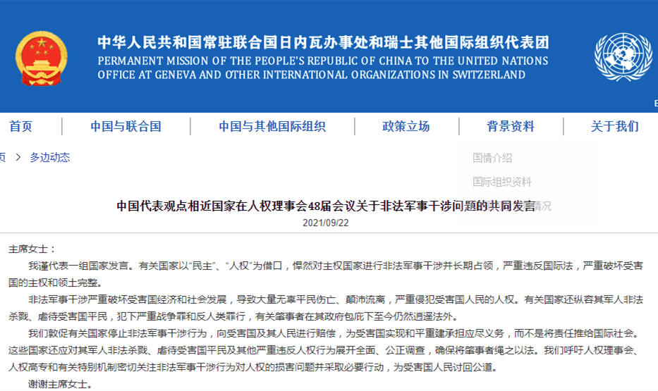 9月22日,中國常駐聯合國日內瓦代表團蔣端公使代表俄羅斯、古巴、斯里蘭卡、伊朗、老撾等十余個觀點相近國家做共同發言,敦促有關國家立即停止非法軍事干涉。 共同發言表示,有關國家以“民主”“人權”為借口,悍然對主權國家進行非法軍事干涉並長期占領,嚴重違反國際法,嚴重破壞受害國的主權和領土完整,嚴重破壞受害國經濟和社會發展,導致大量無辜平民傷亡、顛沛流離,嚴重侵犯受害國人民的人權。有關國家還縱容其軍人非法殺戮、虐待受...