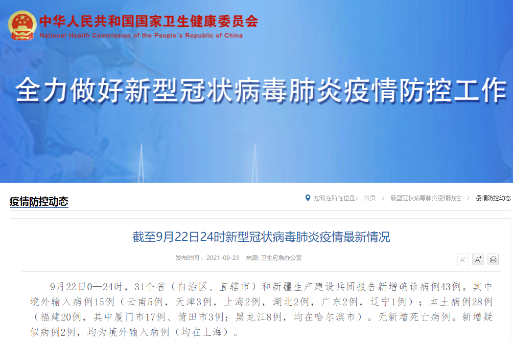 香港新聞網9月23日電 據國家衛健委23日消息,9月22日0—24時,31個省(自治區、直轄市)和新疆生產建設兵團報告新增確診病例43例。其中境外輸入病例15例(雲南5例,天津3例,上海2例,湖北2例,廣東2例,遼寧1例);本土病例28例(福建20例,其中廈門市17例、莆田市3例;黑龍江8例,均在哈爾濱市)。無新增死亡病例。新增疑似病例2例,均為境外輸入病例(均在上海)。 當日新增治愈出院病例37例,解除醫學觀...