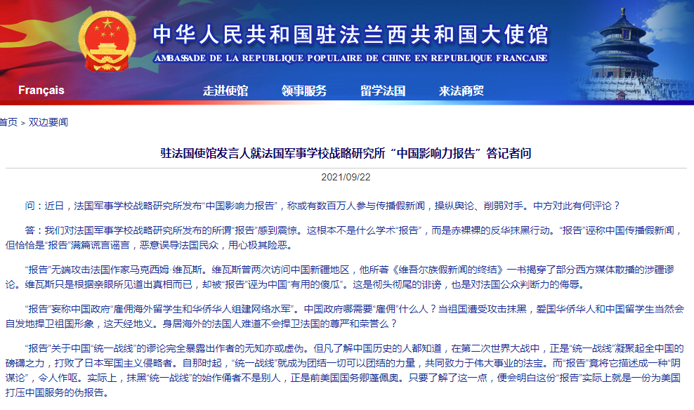 駐法使館回應法國軍事學校戰略研究所“中國影響力報告”