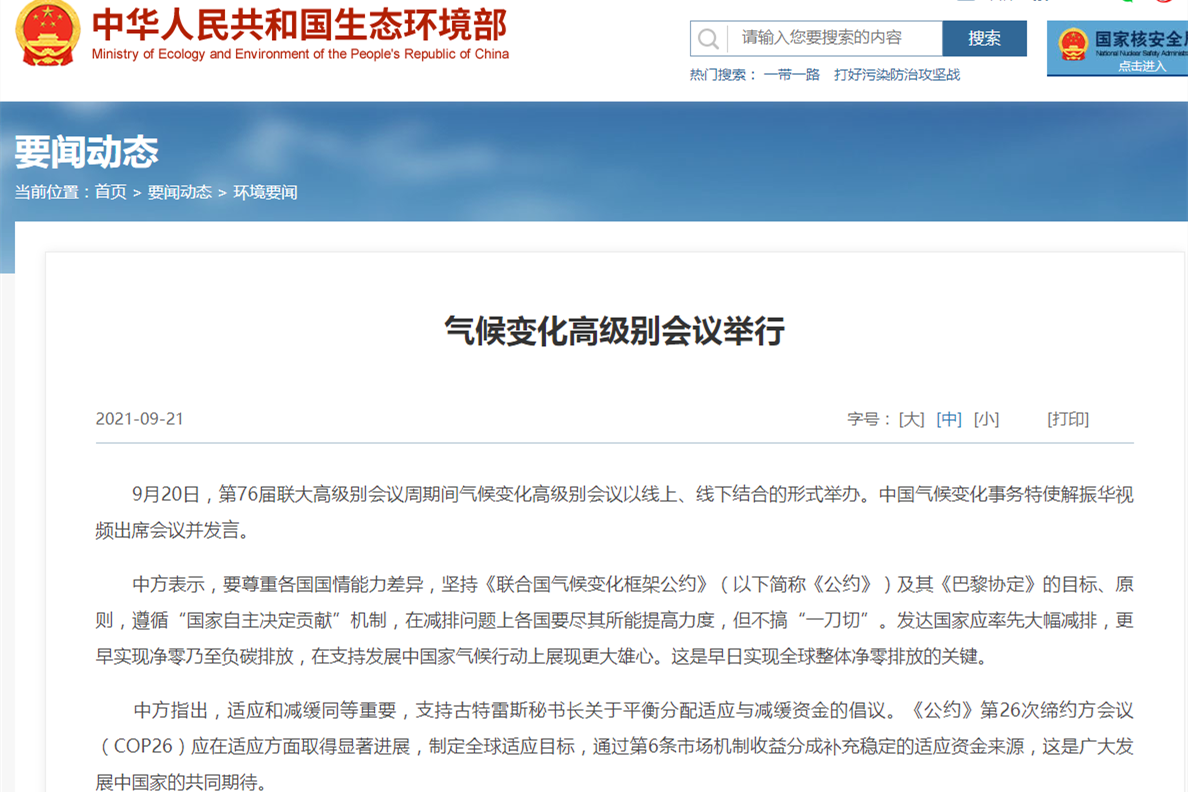 中國生態環境部21日消息,第76屆聯大高級別會議周期間氣候變化高級別會議20日以線上、線下結合的形式舉辦。中國氣候變化事務特使解振華視頻出席會議並發言。中方呼籲,發達國家應率先大幅減排,更早實現凈零乃至負碳排放,在支持發展中國家氣候行動上展現更大雄心。 中方表示,要尊重各國國情能力差異,堅持《聯合國氣候變化框架公約》(以下簡稱《公約》)及其《巴黎協定》的目標、原則,遵循“國家自主決定貢獻”機制,在減排問題上各國...