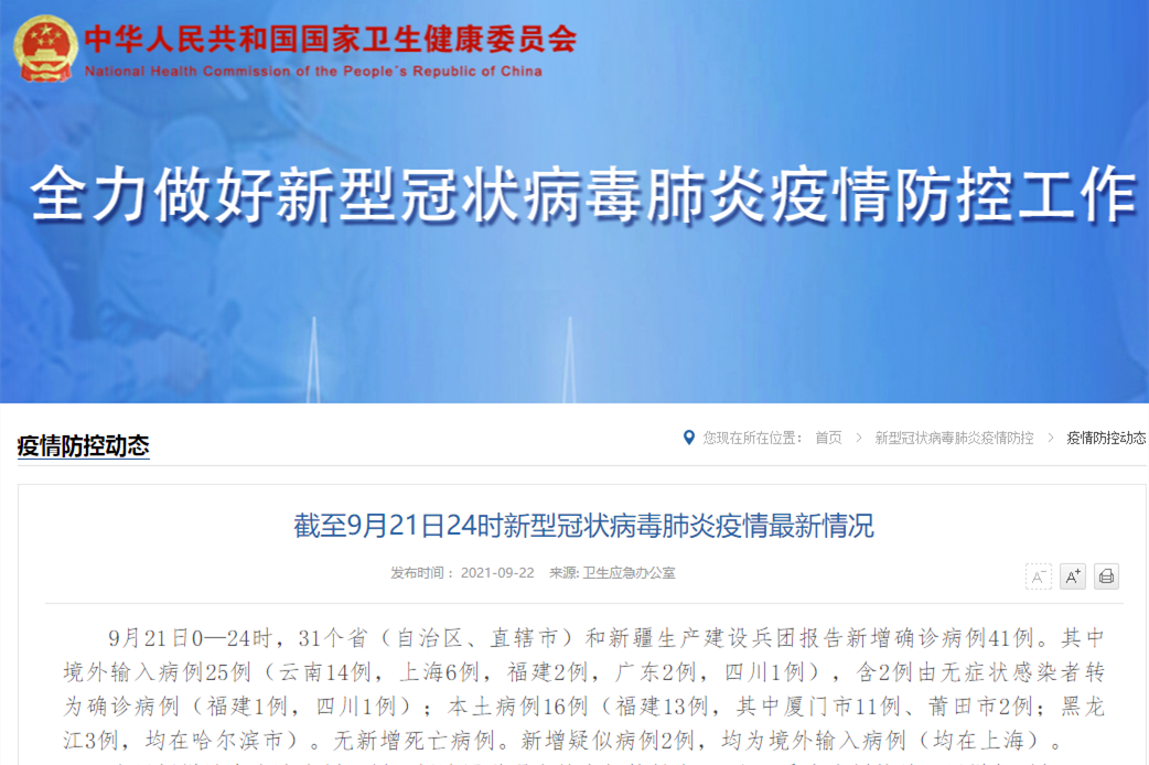 香港新聞網9月22日電 據國家衛健委22日消息,9月21日0—24時,31個省(自治區、直轄市)和新疆生產建設兵團報告新增確診病例41例。其中境外輸入病例25例(雲南14例,上海6例,福建2例,廣東2例,四川1例),含2例由無症狀感染者轉為確診病例(福建1例,四川1例);本土病例16例(福建13例,其中廈門市11例、莆田市2例;黑龍江3例,均在哈爾濱市)。無新增死亡病例。新增疑似病例2例,均為境外輸入病例(均在上...