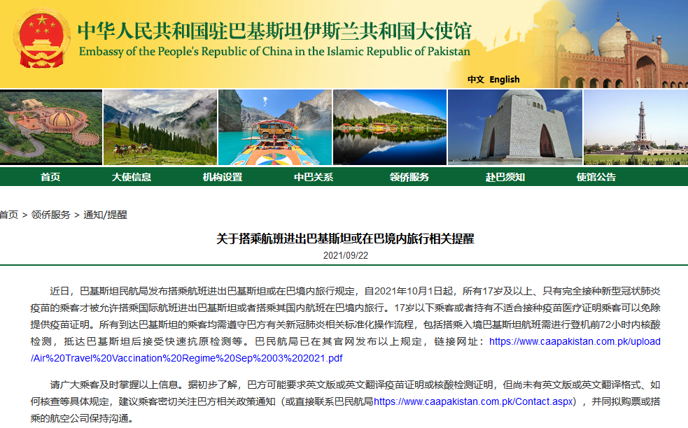 香港新聞網9月22日電 據中國駐巴基斯坦大使館網站9月22日消息,近日,巴基斯坦民航局發佈搭乘航班進出巴基斯坦或在巴境內旅行規定,自2021年10月1日起,所有17歲及以上、只有完全接種新型冠狀肺炎疫苗的乘客才被允許搭乘國際航班進出巴基斯坦或者搭乘其國內航班在巴境內旅行。 17歲以下乘客或者持有不適合接種疫苗醫療證明乘客可以免除提供疫苗證明。所有到達巴基斯坦的乘客均需遵守巴方有關新冠肺炎相關標準化操作流程,包括...