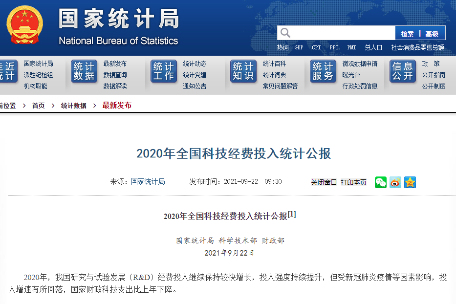 國家統計局發佈2020年全國科技經費投入統計公報